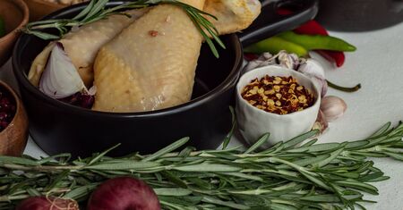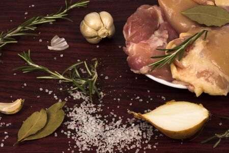 Raw food, meat, chicken, rosemary, onion, garlic, salt, bay leaves, white pepper on dark wooden table.