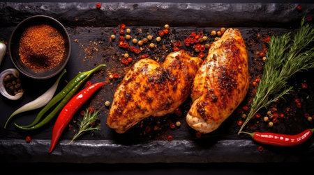 Grilled chicken breast or fillet with garlic chilli herbs and spices on black plate top view / Roast BBQ chicken breast