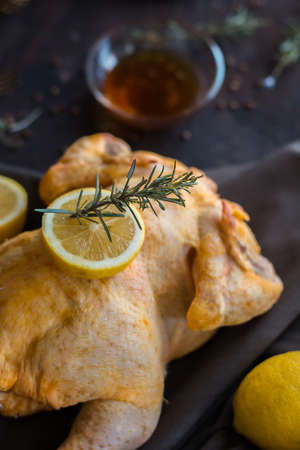 Crude chicken ready to be baked , served with honey, Rosemary, lemon and mustard
