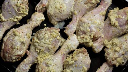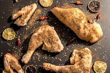 Raw Marinated chicken meat leg swith spices for cooking for BBQ dark background. Top view.Convenience food, precooked.Copy space.