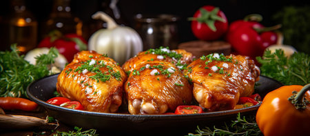 Indulge in this visually appealing image of savory roasted chicken thighs, perfectly marinated with fresh herbs. Ideal for any meal.