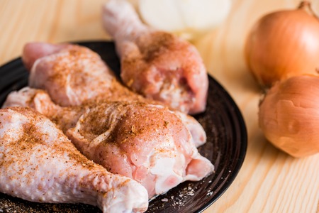 Close up photo of spicy raw chicken legs with lime on wooden board