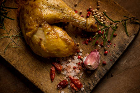 Grilled chicken leg sprinkled with rosemary on a black stone table. Top view with copy space.