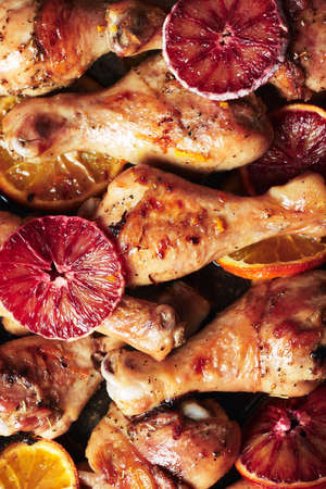 Spice roasted chicken drumstick in roasting pan. Baked chicken legs with oranges.