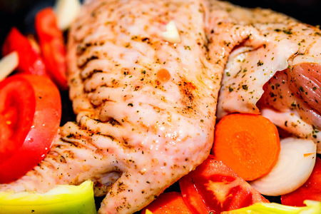 Raw Marinated chicken meat wings in a marinade.Cooking chicken with spices in the oven. Flat lay. Close up