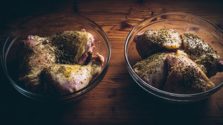 A close-up shot of fresh chicken thighs seasoned with herbs and spices, placed in clear glass bowls on a rustic wooden table, ready for cooking.