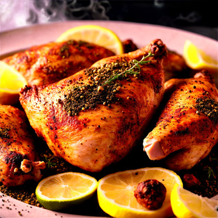 Enjoy a vibrant arrangement of grilled chicken pieces garnished with fresh herbs and spices, ideal for showcasing culinary creativity and flavor.