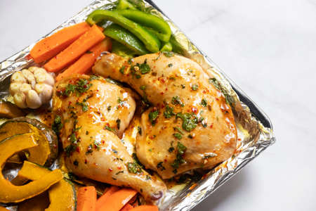 Roasted chicken leg with spice and vegetables sliced in oven tray. Top view on white table background.