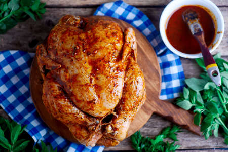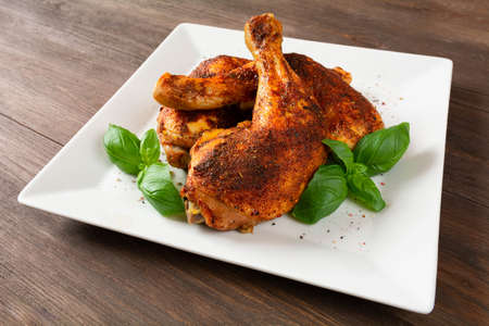 Food concept homemade Roasted, Grilled Whole organic chicken on white ceramic plate