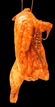 grilled chicken with spices, herbs, and rosemary, captured in a stunning 8k resolution photograph. the image showcases a dark white and amber color palette, highlighting the feminine body of the chicken. the chicken is beautifully wrapped, casting naturalistic shadows that add depth to the composition. this captivating photograph is reminiscent of the works of tintoretto and greg olsen. ai generated