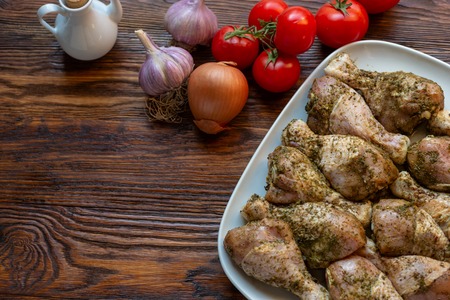 Raw uncooked chicken legs on white dish, wooden background with onion, tomato and garlic.