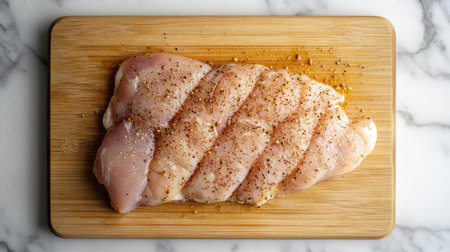 A fresh, raw chicken breast seasoned with spices rests on a wooden cutting board, ready for preparation in a modern kitchen setting. Perfect for culinary use.