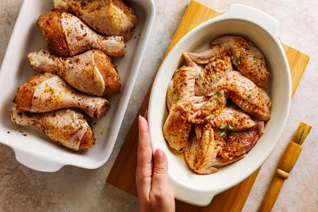 Raw Marinated chicken meat wings in a marinade on a baking sheet.Cooking chicken with spices in the oven. Flat lay