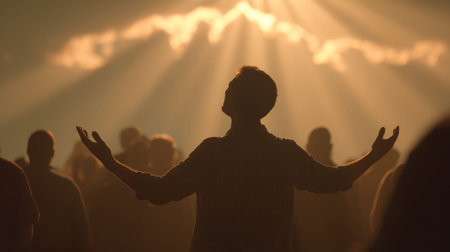 A congregation of people is silhouetted against a bright, central light source, raising their hands toward a cross. The scene is illuminated by an overhead spotlight, creating a dramatic, ethereal atmosphere. The image showcases textures, contrasts, and a composition ideal for promotional content or editorial use in various media.