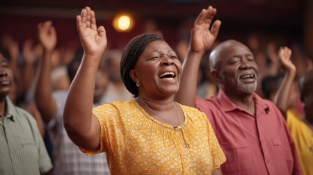 A vibrant church service featuring joyful worshippers with raised hands. Emotional expressions of faith create a lively atmosphere of community and togetherness.