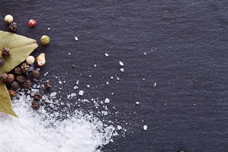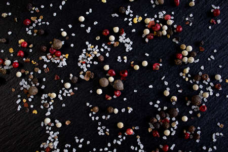 Spices, white, black and red peppers, sea salt sprinkled on a black slate background, close-up top view