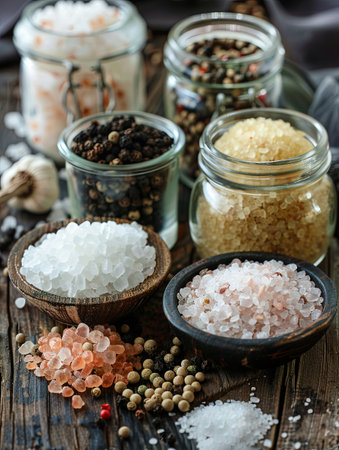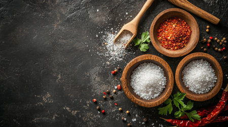 AI Generated. Varieties of salt and spices arranged on a dark stone surface during a culinary preparation session