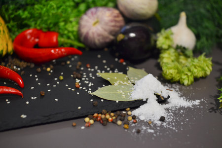 Spices on a stone plate. Black background. Black stone. Garlic, sea salt, pepper, chili, hot pepper, bay leaf