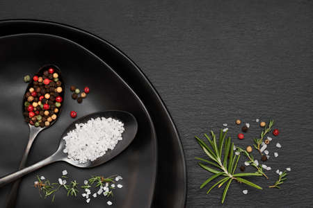 Salt in mixed pepper in dark spoons on black ceramic plates on slate stone with rosemary and thyme herbs