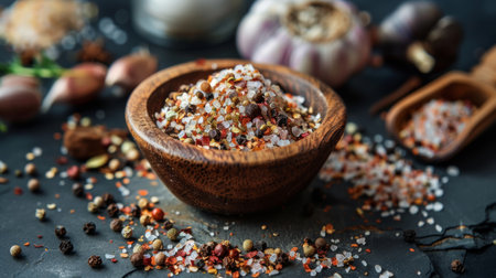 Close-up of a gourmet seasoning mix in a wooden bowl with peppercorns and garlic in the background, creating a rich and flavorful culinary scene.