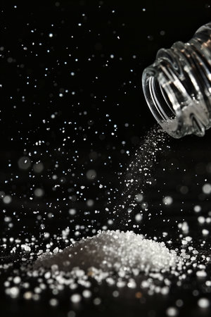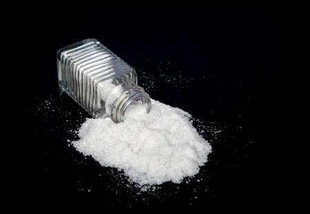Heap of salt from a salt shaker on a black background. The concept of excessive salt intake that can be the cause of diabetes or other diseases.