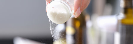 A closeup of salt being sprinkled from a jar onto a wooden surface with fresh vegetables in the background, perfect for culinary projects and recipe ideas.