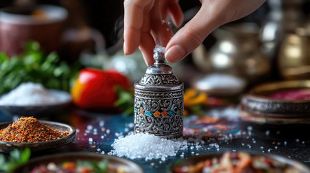 A close-up of a hand reaching for a pinch of salt from a decorative salt shaker, with colorful ingredients in the background, emphasizing seasoning techniques