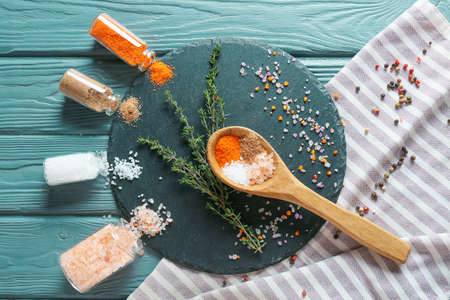 Composition with different salt, herbs and peppercorns on color background, closeup