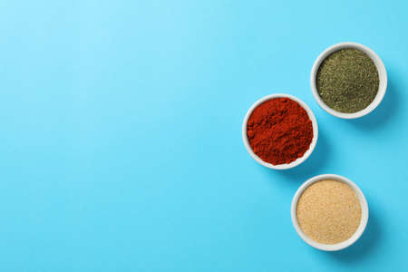 Bowls with red pepper, garlic and dill powder on blue background, top view
