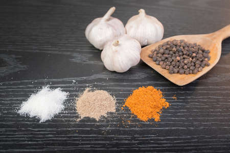 Spices and herbs on a black background. This picture is suitable for decoration in the kitchen and others.