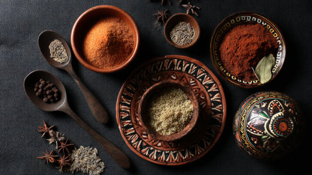 A collection of spices and herbs is elegantly displayed on a dark table. Bowls and spoons hold vibrant powders and seeds, highlighting culinary traditions and flavor possibilities