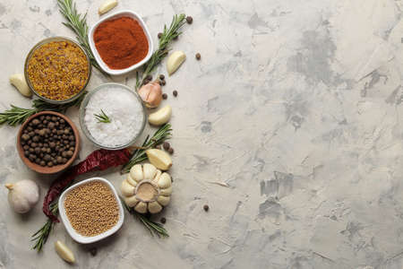 herbs and spices. various seasonings, herbs and spices on a light concrete background. top view. place for text. free space