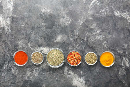 Assortment of colorful spices in glass jars on kitchen table. Dark grey background with copy space. Different types of condiment top view photo.Â