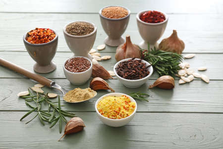Bowls with different spices on wooden background