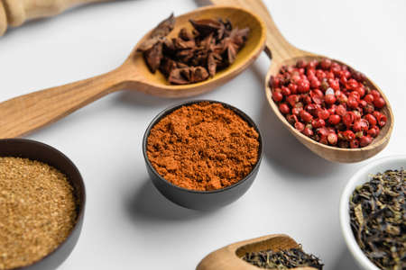 Spices and herbs on table. Food and cuisine ingredients on white table