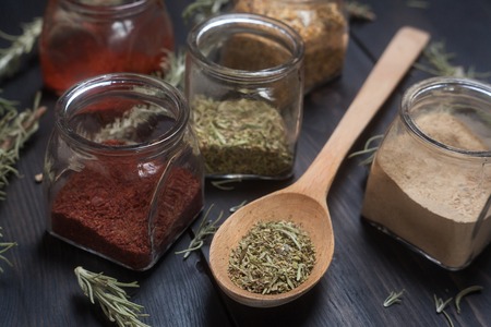 Variety of spices and herbs on kitchen