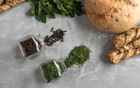 jars with spices and fresh baked cereals bread and herbs on the gray background. Flat lay design