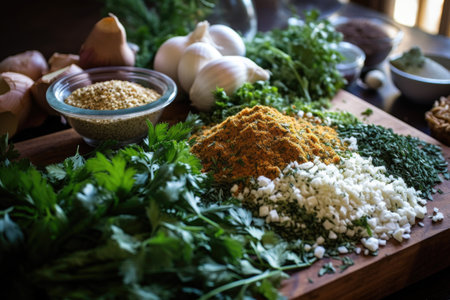 a close-up of ingredients, including herbs and spices, for a delicious recipe, created with generative ai