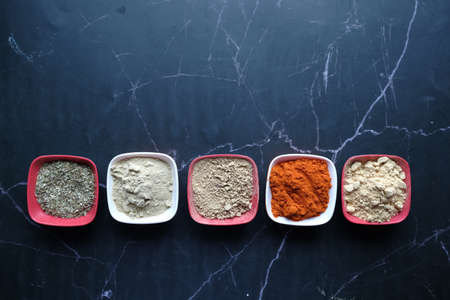 A set of spices in white cups on a black background.