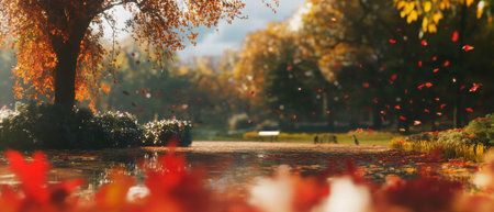 Cinematic view of vibrant autumn foliage in a tranquil park setting