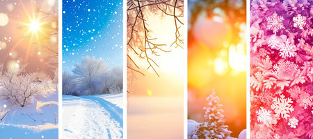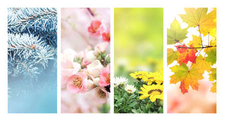 Four seasons of year. Set of vertical nature banners with winter, spring, summer and autumn scenes. Nature collage with seasonal scenics. Copy space for text