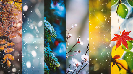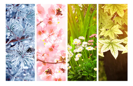 Seasons collage winter, spring, summer, autumn nature photos with colorful vertical lines