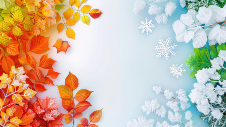 This vibrant illustration captures the stunning transition between autumn and winter, showcasing colorful leaves alongside delicate snowflakes on a serene blue backdrop.