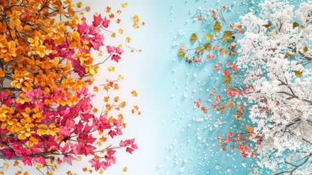 A captivating representation of seasonal change depicting colorful leaves and delicate blossoms against a soft blue background. Ideal for nature themes.