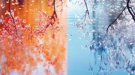 A stunning image showcasing the reflection of vibrant autumn and cool winter trees on calm water, creating a serene and tranquil atmosphere filled with beauty.