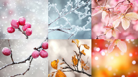 A stunning winter collage featuring vibrant berries, frosty branches, and colorful leaves amidst gentle snowfall, capturing the beauty of nature's seasonal transformation.