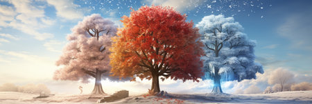 Four side-by-side trees represent the seasons. Autumn is shown with red leaves, followed by yellow leaves, then a tree with changing leaves, and finally winter snowfall.