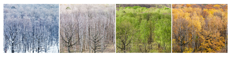 Collage from aerial views of forest in four divisions of the year (winter, spring, summer, autumn)