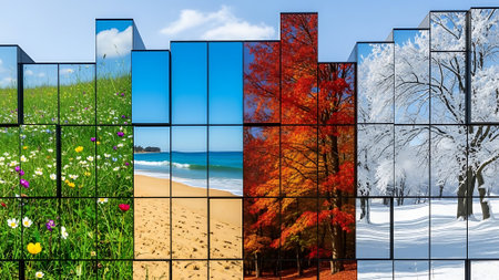 A creative mosaic of seasonal landscapes, from blooming flowers to snowy trees, arranged in a cityscape pattern.