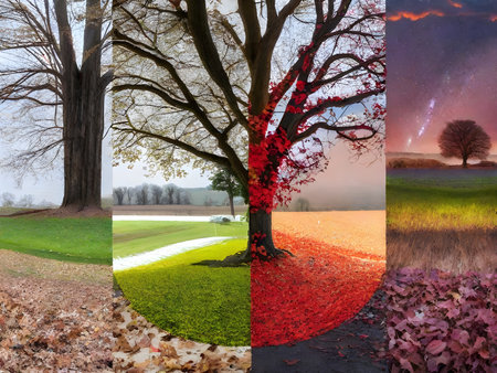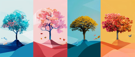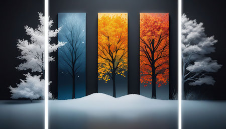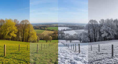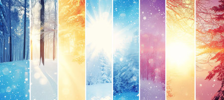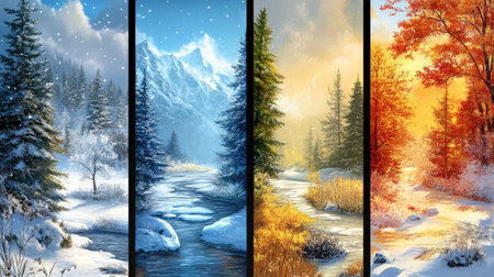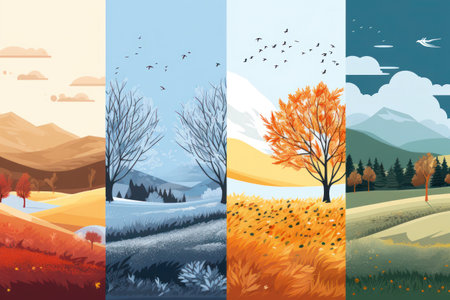 A captivating illustration showcasing the four seasons, featuring a snowy winter scene, a blooming spring landscape, a sunny summer view, and a colorful autumn display in nature.